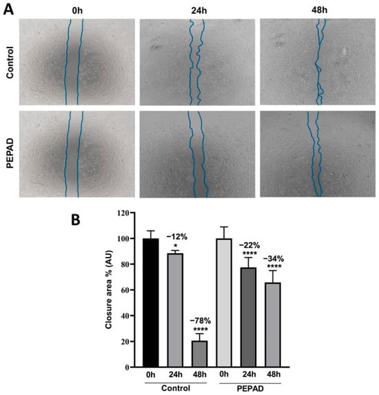 Effects of PEPAD (7.4 μM) on the migration of B16F10-Nex2 murine melanoma cells. (A) Images of the scratch area. (B) Quantitative analysis of the “wound” area. Statistical significance: p < 0.05 (*) and p < 0.0001 (****).