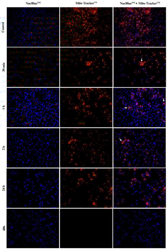 In the control cells, well-distributed and intensely stained mitochondria are visible, with clearly defined nuclei. After 30 min of treatment, some cells show mitochondrial swelling (indicated by arrows), as well as a reduction in the number of mitochondria, which can be attributed to mitochondrial membrane potential loss. From 1 h onwards, increased nuclear fluorescence intensity is also visible, indicating cell death, as NucBlue binds to DNA, and the condensed chromatin facilitates dye binding. Additionally, as cell and nuclear membranes become more permeable in the final stages of apoptosis, this may allow NucBlue to enter cells more easily, further increasing fluorescence intensity. After 48 h, the absence of mitochondrial fluorescence indicates that mitochondria have lost their membrane potential, suggesting that the cells have completed the apoptotic process.