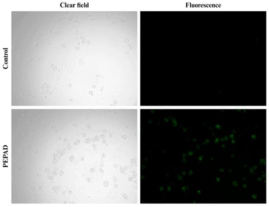 To investigate the mechanism of action of the PEPAD peptide, murine melanoma B16F10-Nex2 cells were treated at the IC50 and evaluated using the FITC-VAD-FMK caspase detection kit. This permeable and non-toxic fluorescent marker irreversibly binds to activated caspases in cells undergoing apoptosis. Fluorescence intensity was then observed (Figure 4). Cells treated with PEPAD for 24 h emitted intense fluorescence, indicating that caspase activation is involved in the peptide’s mechanism of action, leading to apoptosis. In contrast, control cells did not emit fluorescence, suggestive of their integrity and viability. These results reinforce the hypothesis that PEPAD induces apoptosis in B16F10-Nex2 cells as one of its potential mechanisms of action.