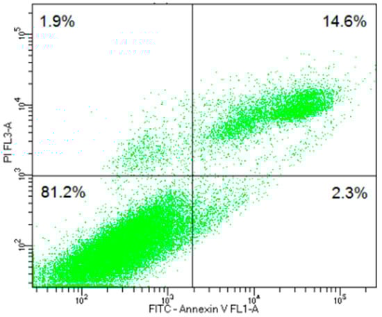 Flow cytometry was performed to further assess cell viability and the apoptotic state (Figure 5). The analysis showed a significant distribution of annexin V-positive cells in quadrant Q4, indicating that a substantial number of cells were in early apoptosis. This suggests that the treatment effectively induced apoptosis without immediately compromising membrane integrity. Additionally, the presence of a population in Q2 (PI+ Annexin V+) indicated that some cells had progressed to late apoptosis, confirming the continuous apoptotic stimulus [].