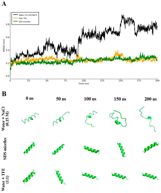 Molecular dynamics analysis of PEPAD in three different environments: water with 0.15 M NaCl, SDS micelles, and 50% TFE. (A) Root mean square deviation (RMSD) of peptide atoms relative to the initial structure, demonstrating higher conformational stability in membrane-mimetic environments (SDS micelles and TFE solution) and reduced stability in aqueous solution. (B) Representative conformations of PEPAD at different time points (0 to 200 ns), showing loss of helical structure in the aqueous environment and preservation of the α-helix in SDS micelles and the TFE solution.