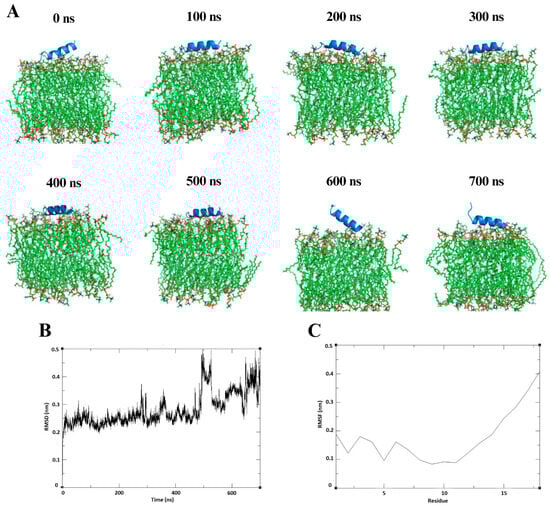 Molecular dynamics of PEPAD interacting with a lipid bilayer composed of 60% POPC, 20% POPE, and 20% POPS over 700 nanoseconds. (A) Interaction of the peptide with the lipid membrane at different times (0 to 700 ns), evidencing the anchoring of the peptide at the lipid interface. (B) RMSD (root mean square deviation) plot of the peptide over time, indicating structural stability up to approximately 600 ns, with greater variation at the end of the simulation. (C) RMSF (root mean square fluctuation) per residue, showing greater flexibility in the terminal regions of the peptide, especially at the C-terminal end.