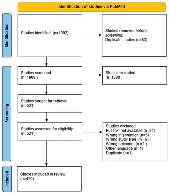 The scoping review identified 479 eligible studies from PubMed (Figure 1), comprising 404 studies on single-ingredient interventions and 75 studies on multi-ingredient interventions (Table 1). Of these, 339 were clinical trials and 140 were case studies. Figure 2 illustrates the annual number of publications retrieved from PubMed between 1980 and 2024, revealing a steady increase in research output, particularly from the early 2000s onward.