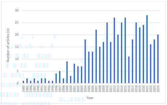 Annual number of PubMed-indexed articles (1980–2024) on the safety of natural products with adaptogenic and/or immunomodulating properties.