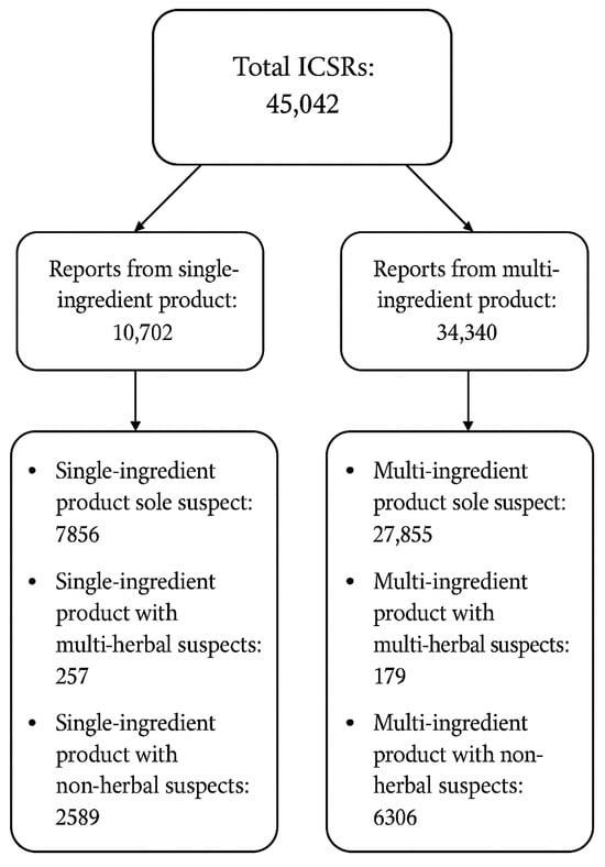 A total of 10,702 ICSRs involved the use of a single-ingredient product. Among these, 7856 reports identified the single-ingredient product as the sole suspected cause of the AE. Additionally, 257 reports involved multiple natural products as suspects, and 2589 reports cited a combination of the natural product and non-herbal products as potential suspects.