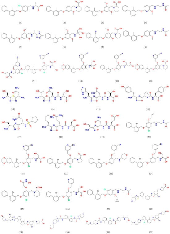 To construct a pharmacophore model for small-molecule PD-L1 inhibitors, the dataset containing small molecules with PD-L1 inhibitory function was assembled from PubMed and the China National Intellectual Property Administration (CNIPA). These compounds include various chemotypes (biphenyl derivatives, heteroaryl biphenyls, thiazoles, benzyl phenyl ethers, imidazo[4,5-c]pyridines, etc.) with IC50 values ranging from 10−4 to 102 nM, ensuring a broad activity range and structural diversity. From this collection, 32 potent inhibitors were selected as a training set for pharmacophore development (Figure 1), and an additional 30 compounds were set aside as a test set for model validation. All selected training-set compounds are reported to target the same PD-L1 surface pocket—the PD-1 binding interface—thereby justifying the development of a single, unified pharmacophore model for this site.