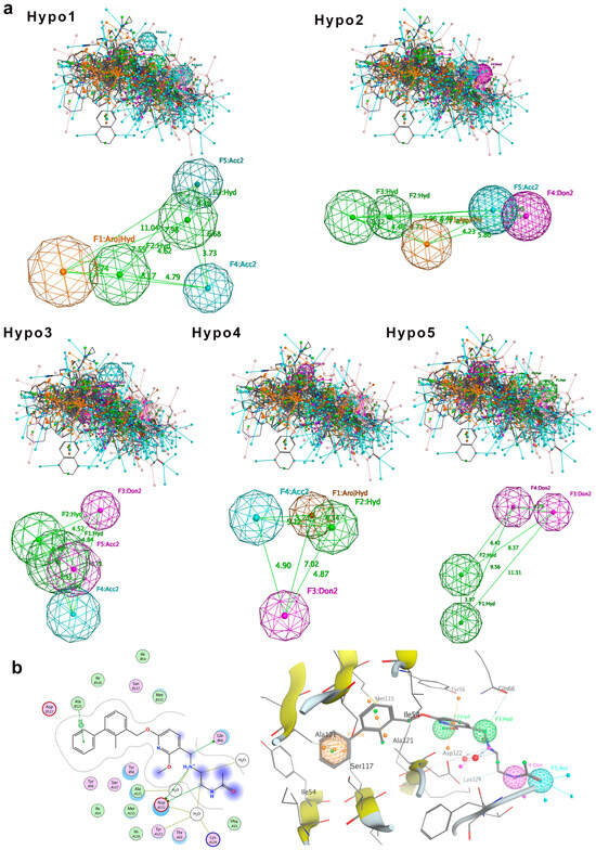 Pharmacophoric features were superimposed by Molecular Operating Environment (MOE) [23]. The superimposed pharmacophoric features include hydrogen bond acceptor (A), hydrogen bond donor (D), hydrophobic feature (H), and ring aromatic feature (R). After molecular superimposition, five pharmacophore models (Hypo1 to Hypo5) were generated for the training set compounds (Figure 2). Among them, three pharmacophore models (Hypo1, Hypo2, and Hypo3) each contain five pharmacophore features, while the other two models (Hypo4 and Hypo5) contain four features each (Figure 2a).