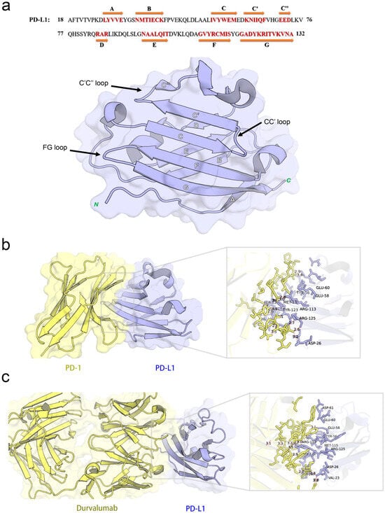 Structural characterization and interaction analyses: (a) crystal structures and sequence alignment of human PD-L1 protein, arrows denote eight β-strands, (b) binding interface between PD-1 and PD-L1, and (c) PD-L1 binding interface interacting with durvalumab.