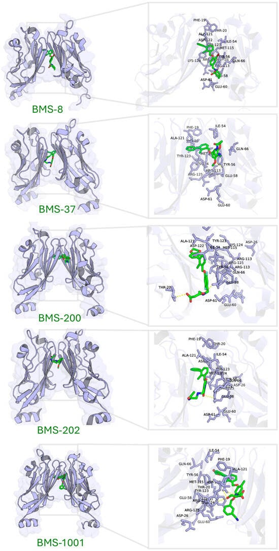 Molecular docking of these inhibitors against dimeric PD-L1 confirmed consistent interaction patterns, particularly involving residues Thr20, Tyr56, Gln66, Met115, Ala121, Asp122, Tyr123, and Lys124 (Figure 4).