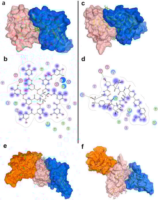 Structural interactions and conformational analysis of candidate inhibitors with PD-L1. Conformation and detailed interactions of tannic acid (a,b) and anidulafungin (c,d) bound to PD-L1; pink denotes PD-L1, and blue denotes PD-1. Docking poses illustrating PD-1 interactions with PD-L1 in the presence of tannic acid (e) and anidulafungin (f). Pink indicates PD-L1, blue denotes the PD-1 conformation without candidate compounds, and orange shows PD-1 optimal binding conformation with candidate compounds present.