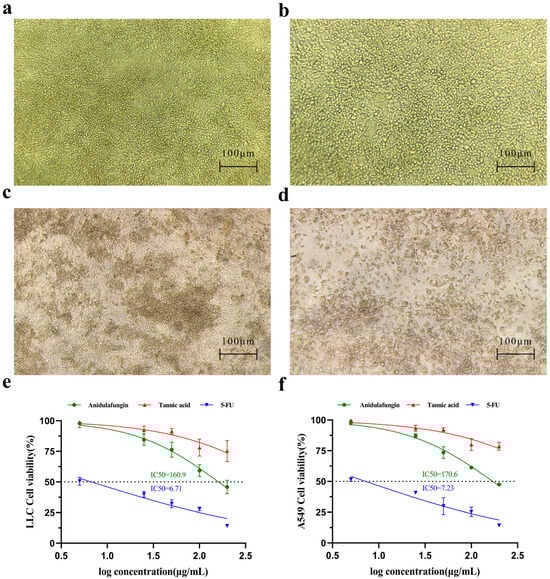 Assessment of cell growth inhibition. Initial morphology of LLC and A549 cells. (a–d) Effects of compounds on LLC cell morphology. Representative images are shown for (a) the negative control group, (b) LLC cells treated with 200 μg/mL tannic acid, (c) LLC cells treated with 200 μg/mL anidulafungin, and (d) LLC cells treated with 200 μg/mL 5-FU. (e,f) Quantitative analysis of cell viability. Dose–response curves are shown for (e) A549 cells and (f) LLC cells after treatment.