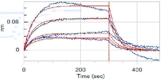The ForteBio (Menlo Park, CA, USA) Octet RED96e bio-layer interferometry system was configured with protein buffer, protein solution, analyte buffer, and analyte solutions at varying concentrations. Protein buffer was formulated as PBS buffer containing 0.1% BSA and 0.02% Tween 20 [29]. The PD-L1 protein solution was prepared by reconstituting lyophilized PD-L1 powder in protein buffer to achieve a final concentration of 10 µg/mL. Analyte buffer was prepared by supplementing PBS buffer with 1% DMSO, 0.1% BSA, and 0.02% Tween 20. Analyte solutions were generated by dissolving anidulafungin in DMSO to prepare a 500 µM stock solution, followed by serial dilution with PBS buffer containing 0.1% BSA and 0.02% Tween 20 to obtain working concentrations of 100, 50, 25, 12.5, and 6.25 µM.