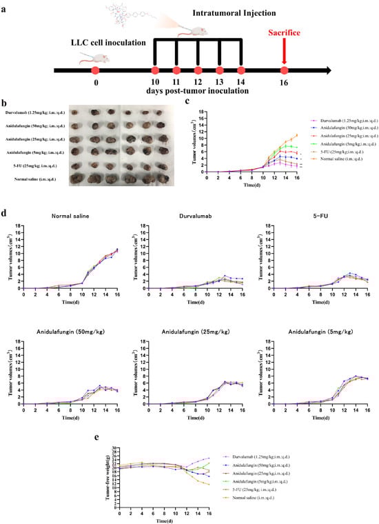 Tumor growth evaluation in vivo: (a) schematic illustration of tumor inoculation, drug administration, tumor volume monitoring, and analysis; (b) images of tumors in mice on day 16; (c) tumor volume changes expressed as mean ± SD (n = 5 per group), statistical significance: * p < 0.05, ** p < 0.01 compared to saline control; (d) individual tumor volumes for mice in all experimental groups; and (e) tumor-free body weight changes in mice.