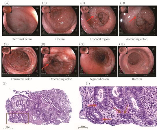 Electronic colonoscopy and pathological images of the patient after Sintilimab. (A–H): Colonoscopy revealed diffuse intestinal involvement from the terminal ileum to the rectum. Specifically, (C) shows diffuse mucosal hyperemia and edema (indicated by arrows); (D) shows the presence of white pseudomembranes (indicated by arrows); and (F) reveals ulcers and herpetiform lesions (indicated by arrows). (I) Hematoxylin and eosin-stained sections of crypt epithelium and a significant reduction in cup cells in colonic tissues, evident in cryptitis, crypt abscesses, crypt atrophy, and structural disturbances in the arrangement of crypt tissues, the area marked with a red box is enlarged in panel (J) to provide a clearer view of the colonic mucosal lesions; and (J) highlights scattered apoptotic bodies within the lamina propria and crypt epithelium (indicated by arrows), suggestive of immune-mediated mucosal injury.