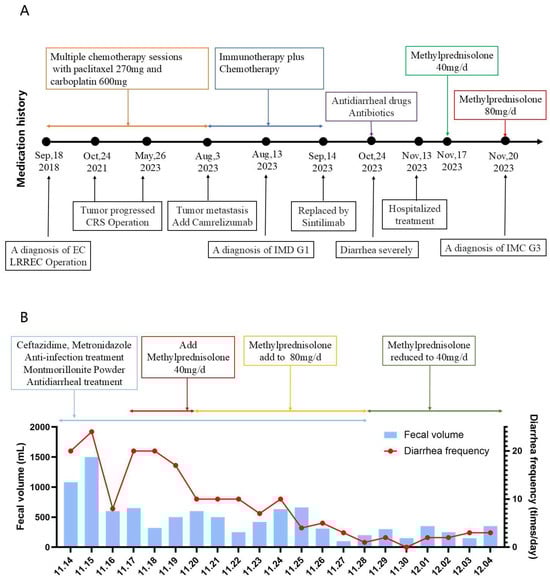 Correlation between diarrhea severity and treatment timeline. (A) Schematic timeline of key therapeutic interventions and clinical events from 2018 to 2023. Key clinical milestones include: initial diagnosis of endometrial carcinoma (EC) and cytoreductive surgery (CRS) (September 2018); disease progression (October 2021); metastatic spread and initiation of camrelizumab (May 2023); transition to sintilimab (3 August 2023); hospitalization (13 August 2023); diagnosis of grade 1 immune-mediated diarrhea/colitis (IMD G1) (14 September 2023); and subsequent diagnosis of grade 3 immune-mediated colitis (IMC G3) (24 October 2023). Detailed management of IMC G3 is illustrated in panel. (B) Quantification of diarrheal symptoms (fecal volume and frequency) in hospital. Anti-infectives (ceftazidime, metronidazole), smectite (antidiarrheal), and methylprednisolone dose adjustments (40 mg/d on 13 Nov → 80 mg/d on 17 Nov → 40 mg/d on 20 Nov).