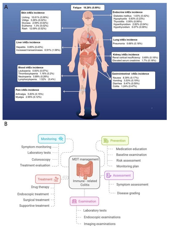 Incidence of irAEs to PD-1 inhibitors and multidisciplinary management of ir-colitis. (A) Overview of common immune-related adverse events (irAEs) associated with immune checkpoint inhibitors (ICIs), categorized by organ system and reported incidence. Fatigue is the most frequently observed irAE, followed by dermatologic, gastrointestinal, hepatic, endocrine, pulmonary, renal, and hematologic toxicities. Data represents overall and high-grade (≥Grade 3) incidence rates. (B) Multidisciplinary team (MDT) management framework for immune-related colitis. Key components include symptom monitoring, preventive strategies, early assessment, diagnostic examinations, and multimodal treatment approaches such as pharmacologic, endoscopic, or surgical interventions.