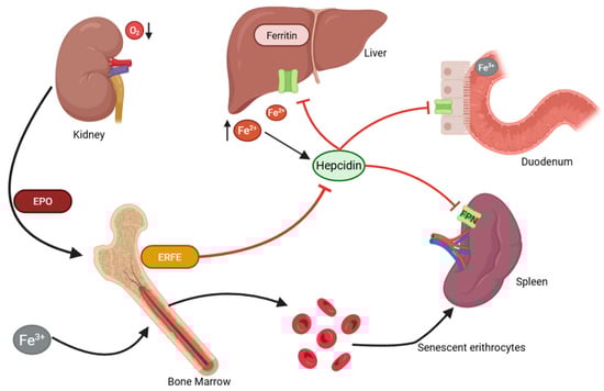 - Pasricha, S.R.; McHugh, K.; Drakesmith, H. Regulation of Hepcidin by Erythropoiesis: The Story so Far. Annu. Rev. Nutr. 2016, 36, 417–434. [Google Scholar] [CrossRef] [PubMed]