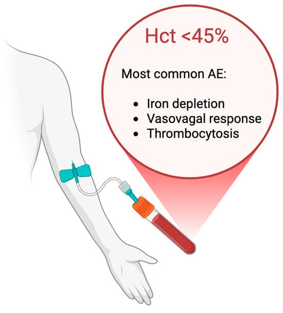 - Romón, I.; Domíguez-García, J.; Fernández, C.; Carretón, M.; Martínez, N.; Calzada, L.; Cortés, M.A.; Mendez, G.A.; Gorostidi, I.; Briz, M.; et al. Adverse Effects of Therapeutic Phlebotomies: Prospective Study of 587 Procedures. Transfusion 2024, 64, 1262–1269. [Google Scholar] [CrossRef] [PubMed]