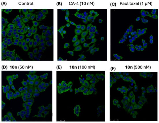 Compound 10n depolymerises the microtubule network of MCF-7 breast cancer cells. Cells were treated with (A) vehicle control (0.1% ethanol (v/v)), (B) CA-4 (10 nM), (C) paclitaxel (1 μM) and compound 10n, (D) (50 nM), (E) (100 nM) and (F) (500 nM) for 16 h. Cells were fixed in ice-cold methanol and stained with mouse monoclonal anti-α-tubulin–FITC antibody (clone DM1A) (green) and Alexa Fluor 488 dye, and counterstained with DAPI (blue). Images were obtained with Leica SP8 confocal microscopy with Leica application suite X software. Representative confocal micrographs of three separate experiments are shown. Scale bar indicates 25 μm.