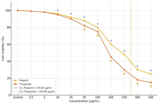 Dose-dependent changes in viability of AML12 hepatocytes following Propofol and Thiopental exposure [17]. Figure depicts the percentage of viable cells after treatment with increasing concentrations of each anesthetic agent. Both Propofol and Thiopental significantly decreased cell viability at concentrations ≥ 100 µg/mL compared to the control group (p < 0.001). Notably, at concentrations of 200, 250, and 500 µg/mL, Propofol induced significantly less cytotoxicity than Thiopental (p < 0.001). IC50 values were calculated as 255.008 µg/mL for Propofol and 254.904 µg/mL for Thiopental. Data are presented as mean ± standard deviation (SD). * indicates p < 0.001 compared to the control group for Propofol; # indicates p < 0.001 compared to the control group for Thiopental.