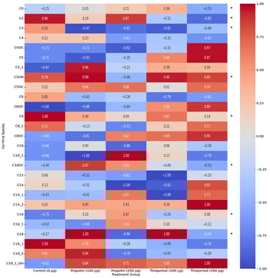 Heatmap of intracellular carnitine and acylcarnitine profiles in AML12 hepatocytes after Propofol and Thiopental exposure. Heatmap showing the normalized intracellular levels of carnitine and acylcarnitine species in AML12 hepatocytes following exposure to cumulative doses (100 µg and 200 µg) of Propofol and Thiopental. Data were normalized to a range of –1 to +1. (*) indicate metabolites that exhibited statistically significant changes compared to the control group (p < 0.05).