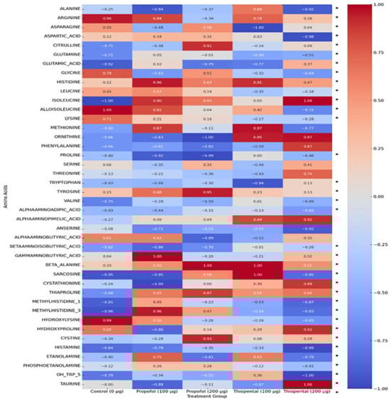Normalized heatmap of amino acid profiles in AML12 hepatocytes exposed to Propofol and Thiopental. Heatmap representation of normalized amino acid concentrations in AML12 hepatocytes after exposure to 100 µg and 200 µg doses of Propofol and Thiopental. Values are scaled between 1 and +1. (*) indicate statistically significant changes compared to the control group (p < 0.05).
