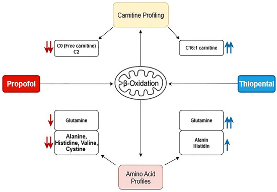 To visually summarize the differential metabolic effects of Propofol and Thiopental, we present an integrated schematic (Figure 4) that depicts their impact on mitochondrial β-oxidation and amino acid metabolism. As shown, Propofol induces widespread suppression of free carnitine, long-chain acylcarnitines, and key amino acids such as glutamine and alanine, reflecting impaired fatty acid transport and mitochondrial energy production. In contrast, Thiopental demonstrates partial preservation or even restoration of certain acylcarnitines and amino acids, suggesting a more adaptive metabolic response. These pathway-specific alterations are consistent with the quantitative data presented in Table 1 and Table 2 and Figure 2 and Figure 3 and may offer mechanistic insight into anesthetic-specific metabolic stress responses.