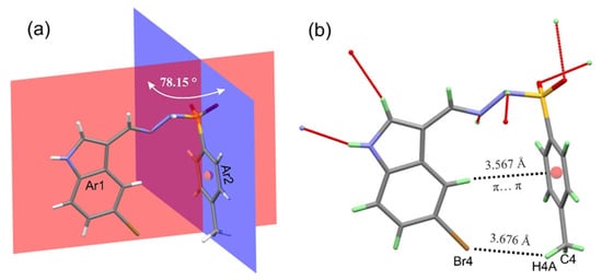 Two intramolecular interactions are illustrated in Figure 3b: a T-shaped π–π stacking interaction with a distance of 3.567 Å between the centroid and H7 and a C–H···Br halogen bond with a distance of 3.676 Å. Both interactions contribute to stabilizing the molecular conformation and may influence the overall crystal packing.