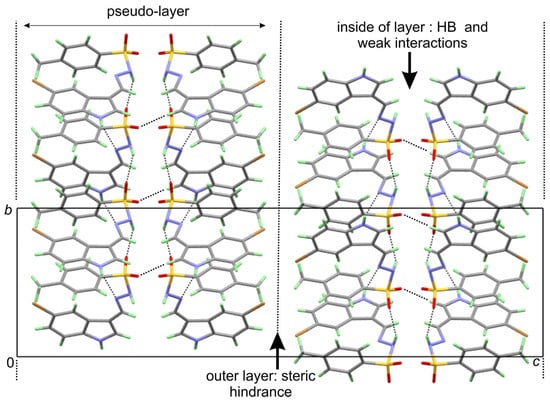 The three-dimensional crystal packing of compound 3e (Figure 4) shows the formation of pseudo-layers, with the sulfonyl moiety positioned in the interior of these layers. The packing is governed by a network of hydrogen bonds (N–H···N and N–H···O) and weak C–H···O interactions, facilitating close packing. Meanwhile, the outer part of the layers is affected by steric hindrance from bulkier methyl groups and Br···Br repulsion. The combination of these interactions stabilizes the overall crystal growth and packing efficiency in compound 3e.