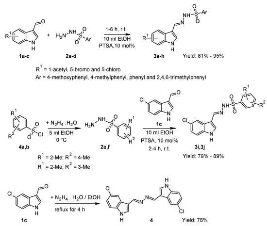 Compounds 3i and 3j were synthesized in two steps. First, substituted benzenesulfonyl chlorides (4a,b) were reacted with hydrazine hydrate in ethanol to obtain sulfonylhydrazides (2e,f). Subsequently, 5-chloro-1H-indole-3-carbaldehyde (1c) was added to the sulfonylhydrazide products 2e,f to yield N′[-1H-indol-3-ylmethylidene] benzenesulfonohydrazide derivatives (3i and 3j), following the procedure of Navakoski de Oliveira and Jose Nunes [61], with modifications.
