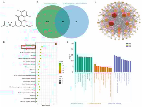To elucidate the potential therapeutic mechanisms of β-Acetoxyisovalerylalkannin in skin inflammation, we conducted an integrated network pharmacology and molecular docking study. Our analysis identified 66 overlapping targets between β-Acetoxyisovalerylalkannin and inflammatory skin diseases, as demonstrated via Venn diagram analysis (Figure 1B). The study objectives were then pursued through constructing a protein–protein interaction network and performing a functional treasure hunt. An analysis of the KEGG pathways showed that the anti-inflammatory prowess of β-Acetoxyisovalerylalkannin largely depended on adapting four key signaling channels: the MAPK, PI3K/AKT, TNF, and JAK-STAT pathways. Initially, molecular docking was used to check the compatibility between β-Acetoxyisovalerylalkannin and the two main elements in the MAPK pathway: ERK1 and p38. The binding energies of −9.4 kJ·mol−1 for ERK1 and −7.2 kJ·mol−1 for p38 indicated strong ligand–receptor interactions, with negative values suggesting favorable binding affinity. These findings suggest that β-Acetoxyisovalerylalkannin may exert its anti-inflammatory effects through the targeted regulation of the MAPK signaling pathway. The robust binding interactions observed with ERK1 and p38 proteins provide molecular-level evidence supporting the compound’s potential as a therapeutic agent for treating inflammatory skin conditions.