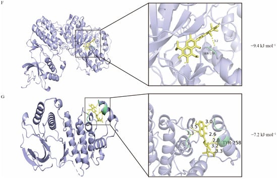 Network pharmacology and molecular docking. (A) β-Acetoxyisovalarylalkannin structural formula; (B) Venn diagram; (C) protein interaction network diagram (PPI diagram); (D,E) KEGG path enrichment analysis and GO diagram; (F,G) molecular docking results of β-Acetoxyisovalerylalkannin with ERK1/2 and p38 (Blue represents the protein structure, yellow represents the drug molecule structure, and green represents the amino acid residue).