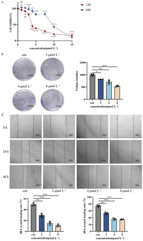 HaCaT cells in the logarithmic growth phase were seeded in 96-well plates at a density of 8000 cells per well. Once the cells reached 60–70% confluence, β-Acetoxyisovalerylalkannin concentrations of 1.0, 2.0, 3.0, 4.0, 5.0, 7.5, 10, and 15.0 μmol·L−1 were added for 24 and 48 h. After the treatment period, each well received 100 μL of CCK-8 solution, followed by a 30 min incubation period at 37 °C. Optical density readings were taken at 450 nm using a microplate reader (Thermo Fisher, Waltham, MA, USA). Cell viability percentages were determined using the following formula: cell viability (%) = [(ODExperimental group − ODblank group)/(ODControl group − ODblank group)] × 100%. This calculation provided a quantitative assessment of cellular metabolic activity relative to untreated controls.