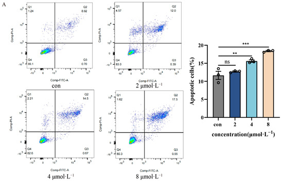 HaCaT cells were seeded in six-well plates at a density of 3.5 × 105 cells/well and grouped according to the protocol described in Section 4.2.4. Each group was treated with varying concentrations of drug-containing medium for 48 h. Once the cells had finished incubating, the medium was carefully gathered, and the cells were detached using EDTA-free trypsin, a process known as trypsinization. Following centrifugation at 500× g for 5 min at 4 °C, the cell pellet was resuspended in ice-cold 1× Binding Buffer. Subsequently, 100 μL of the cell suspension was aliquoted into a flow cytometry tube, followed by the sequential addition of 5 μL of Annexin V-FITC and 5 μL of propidium iodide (PI), with gentle mixing after each reagent. The concoction was mixed delicately to ensure everything was well blended, then left to incubate in the dark, at room temperature, for 8–10 min. Post-incubation, 400 μL of pre-cooled 1× Binding Buffer was poured in, and the samples were promptly assessed using a flow cytometer (BD Biosciences, Franklin Lakes, NJ, USA) within 1 h.