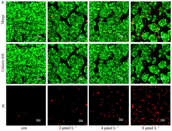 HaCaT cells were plated in 12-well culture dishes at a concentration of 1 × 105 cells per well and subjected to the treatment protocols outlined in Section 4.2.4. The cells were incubated with predetermined doses of β-Acetoxyisovalerylalkannin for 48 h while being maintained in complete growth medium. After the exposure period, researchers carefully removed the culture medium and performed two PBS washes to gently rinse the cell monolayers. For viability assessment, cells were incubated with 2 μmol·L−1 of Calcein-AM for 30 min at 37 °C in a humidified 5% CO2 atmosphere. After PBS washing, the PI working solution was added and incubated for 15 min at room temperature under light-protected conditions. Following two additional PBS washes, cells were immediately covered with antifade mounting medium and visualized using an inverted fluorescence microscope (Leica Microsystems CMS GmbH, Wetzlar, Germany).