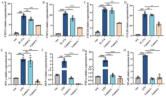 The effect of β-Acetoxyisovalerylalkannin on the expression of related cytokines in HaCaT cells. (A–D) RT-qPCR was used to detect the mRNA levels of CXCL1, CXCL2, CXCL8, and CCL20 after IL-17A induction; (E–H) RT-qPCR was used to detect the mRNA levels of IFN-γ, MCP-1, TNF-α, and NF-κB after LPS induction. Data are mean ± SD. ### p < 0.001 and #### p < 0.0001 vs. con; statistical significance is: ns, indicating no significant difference; * p < 0.05, ** p < 0.01, *** p < 0.001, and **** p < 0.0001 vs. IL-17A/LPS, n = 3, analyzed via one-way ANOVA.