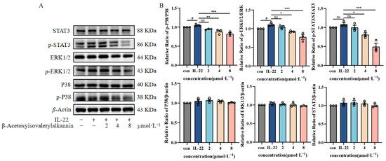β-Acetoxyisovalerylalkannin activates the intracellular MAPK/STAT3 signaling pathway: (A) protein expression of p-P38, P38, p-ERK1/2, ERK1/2, p-STAT3, and STAT3 in HaCaT treated with β-Acetoxyisovalerylalkannin; (B) quantification of the protein expression of p-P38, P38, p-ERK1/2, ERK1/2, p-STAT3, and STAT3 (n = 3). Data are mean ± SD. Statistical significance is: ns, indicating no significant difference; # p < 0.05 vs. con; statistical significance is ns, indicating no significant difference; * p < 0.05, ** p < 0.01, and *** p < 0.001 vs. IL-22, n = 3; analyzed via one-way ANOVA.