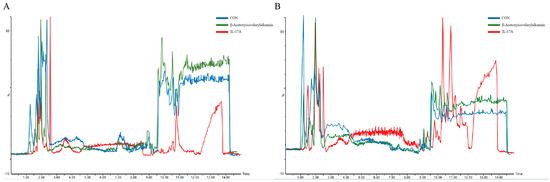 HaCaT cells were planted in six-well dishes at a concentration of 5 × 105 cells per dish and then split into three categories: the control set, the IL-17A model group (25 ng·mL−1), and the β-Acetoxyisovalerylalkannin group (4 μmol·L−1). The model and experimental groups were treated with the corresponding drug-containing medium and incubated for 48 h. After treatment, cells were lysed with 80% pre-cooled acetonitrile and centrifuged at 10 min, 4 °C, and 12,000× g. The supernatant was dried under nitrogen and reconstituted in 50% acetonitrile, followed by centrifugation at 4 °C for 10 min. The supernatant was then collected into an injection vial for analysis. The UPLC-Q-TOF/MS (Xevo G2-XSQ-TOF Quadrupole Time-of-Flight Mass Spectrometer; Waters, Milford, MA, USA) detection involved specific chromatographic conditions. Mobile phase A was a buffered aqueous solution with a trace of 0.1% formic acid, while mobile phase B was composed of pure acetonitrile. We utilized a gradual gradient elution scheme that began at 2% of phase B at 0–0.5 min, then increased to 7% over the next 15 min, increased further to 40% between 15 and 22 min, increased again to 67% from 22 to 25 min, and finally reached 100% at 25 min, before decreasing to the starting point of 2% by the 40 min mark. The flow rate was set to a consistent 0.3 mL·min−1, and a 5 μL injection was used. The column was kept cool at 35 °C throughout the process. In terms of mass spectrometry, we employed electrospray ionization in both positive and negative ion modes, with a scan spectrum that spanned from 50 to 1200 Daltons and took one second per scan. The cone voltage was 40 V, and the ionization was 120 °C, with the collision energy varying from a modest 10 eV to a notable 45 eV. For a fail-safe quality check, we prepared a QC sample by merging the equivalent parts of all experimental samples and ran it alongside the others to ensure uniform quality standards.