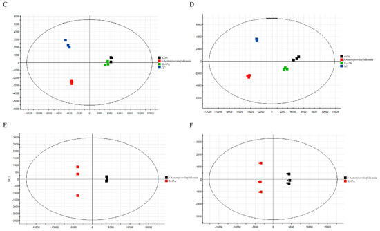 (A,B) Ion plots for positive and negative ion modes; (C,D) PCA score plots for positive and negative patterns; (E,F) OPLS–DA plots in positive and negative modes.