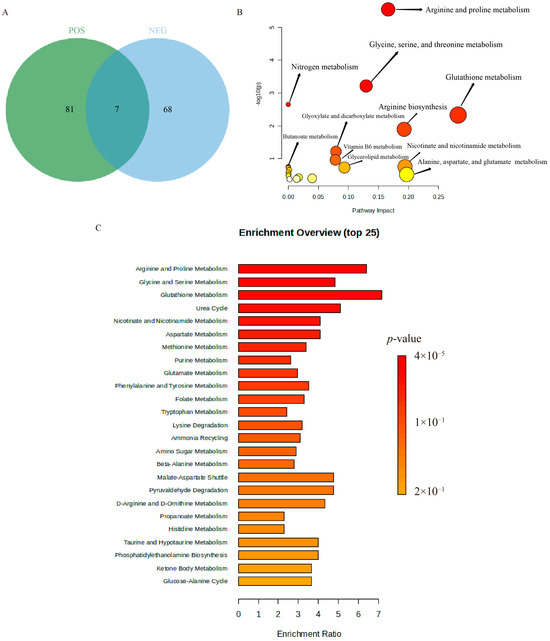 Enrichment analysis plots of different metabolites: (A) Venn diagram illustrating overlapping differential metabolites detected in both positive and negative ion modes; (B) pathway analysis diagram of differential metabolites; (C) KEGG enrichment analysis map.