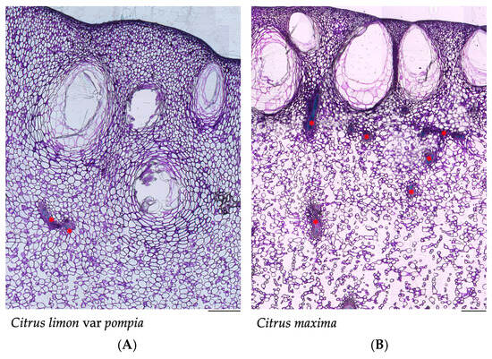 A representative section of the histological cross-section of (A) Pompia fruit and of (B) Citrus maxima. Red asterisks (*) indicate vascular bundles. Scale bar = 500 µm (×4).