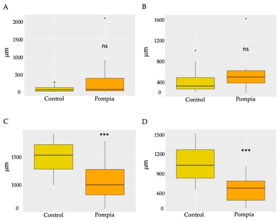Box plot representing the measured histological parameters. Within each box, horizontal black lines denote median values; boxes extend from the 25th to the 75th percentile of each group’s distribution of values; vertical extending lines denote adjacent values (i.e., the most extreme values within 1.5 interquartile range of the 25th and 75th percentile of each group); dots denote observations outside the range of adjacent values: (A) distance of the secretory cavities from the epidermis, (B) distance of the secretory cavities from the vascular bundles, (C) height of the secretory cavities and (D) width of the secretory cavities. Citrus maxima samples are shown in yellow, and Pompia samples are shown in orange. *** p < 0.001; ns: not significant.
