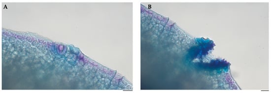 After fixation and staining, the outer portion of the flavedo was observed under a light microscope. A representative section of the Pompia fruit (Figure 1A) and C. maxima (Figure 1B) is presented.