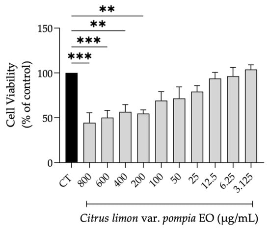 Effect of Pompia essential oil on the viability of NIH/3T3 fibroblasts. Bars represent the mean ± SEM of at least three independent experiments performed in duplicate. ** p < 0.01, *** p < 0.001, compared to control (untreated) cells.
