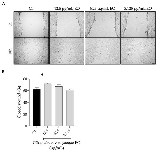 Effect of Pompia EO on NIH/3T3 fibroblasts’ cell migration. (A) Representative bright-field images of NIH/3T3 fibroblasts at 0 h and 18 h post-scratch; scale bar = 100 µm (×10). (B) Percentage of wound closure after 18 h of wound induction of NIH/3T3 fibroblasts in the presence (grey bars) and absence (black bar) of Pompia EO. Bars represent the mean ± SEM of at least three independent experiments performed in duplicate. * p < 0.05, compared to control (untreated) cells.