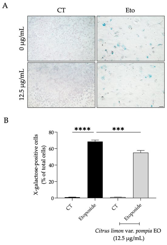 Effect of Pompia EO on etoposide-induced beta-galactosidase activity. (A) Representative bright-field images of NIH/3T3 fibroblasts, treated with etoposide (12.5 µM) for 24 h and left to recover for 7 days in the presence or absence of Pompia EO. The blue staining indicates positive cells for β-galactosidase; scale bar = 100 µm (×10). (B) Percentage of X-galactose-positive cells in NIH/3T3 fibroblasts treated with etoposide (12.5 µM) for 24 h and left to recover for 7 days in the presence (gray bars) or absence (black bars) of Pompia EO. Bars represent the mean ± SEM of at least three independent experiments, in which a minimum of 100 cells were counted. *** p < 0.001, **** p < 0.0001, compared to cells treated with etoposide alone (black bar).