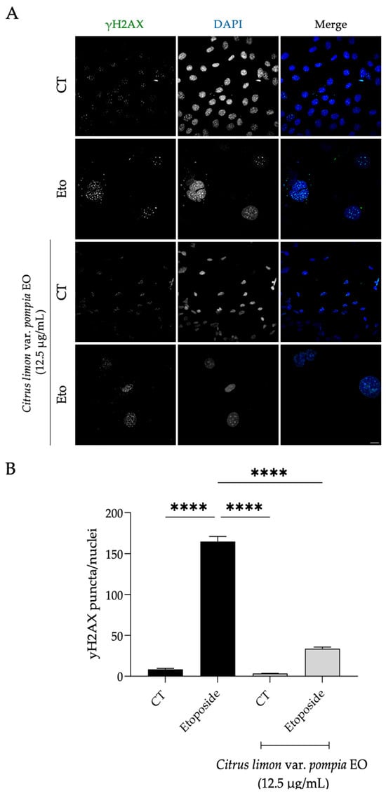 Effect of Pompia EO on etoposide-induced double-strand DNA breaks. (A) Representative confocal microscopy images of NIH/3T3 fibroblasts treated with etoposide (Eto; 12.5 µM) for 24 h and left to recover for 7 days in the presence or absence of Pompia EO. γH2AX was stained with Alexa Fluor 647, and nuclei were counterstained with DAPI; scale bar = 20 µm (×63). (B) Percentage of γH2AX puncta per nucleus in NIH/3T3 fibroblasts treated as described above. Gray bars represent cells treated with Pompia EO during the recovery phase; black bars indicate cells treated with etoposide only. Bars represent the mean ± SEM of at least three independent experiments, in which a minimum of 100 cells were counted. **** p < 0.0001 when compared to cells treated with etoposide only (black bar).
