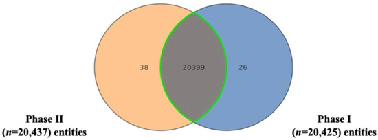 Venn diagram representing the count of shared and unique metabolic features between the two experimental phases, following data filtering. The overlap of mass ions (n = 20,399) detected in Phase I (n = 20,425) and Phase II (n = 20,437) under both positive and negative ionization modes, as analyzed by Mass Profiler Professional (MPP) software.