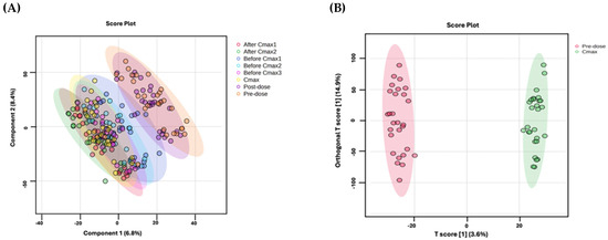 Orthogonal projections to latent structures discriminant analysis (OPLS-DA) was applied to compare pre-dose vs. Cmax metabolic profiles across all 14 subjects. As shown in Figure 2B, the model demonstrates a clear separation of these two time points (Q2 = 0.768, R2Y = 0.993), indicating a robust and highly reliable capability to distinguish between the metabolic states associated with drug administration.