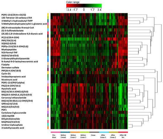 Hierarchical clustering and heatmap analysis of the 31 significantly dysregulated endogenous metabolites identified following Sacubitril/Valsartan administration in healthy subjects. Metabolite intensities were normalized and visualized across eight individualized time points: pre-dose, three time points before Cmax (before Cmax 1–3), at Cmax, two time points after Cmax (after Cmax 1–2), and 48 h post dose. Clustering was performed using Pearson correlation distance and average linkage to group both metabolites (rows) and time points (columns). Color-coding reflects the normalized expression level of each metabolite: red indicates upregulation (positive deviation from the median), green indicates downregulation (negative deviation from the median), and black represents expression levels close to the median. The color range spans from –3.4 (green, minimum relative abundance) to +3.4 (red, maximum relative abundance), as indicated by the color bar at the top of the figure. Key dysregulated metabolites include uridine triphosphate (UTP), associated with pyrimidine metabolism and cell cycle regulation. All pathway names and metabolite abbreviations are fully defined within the figure or accompanying Supplementary Table.
